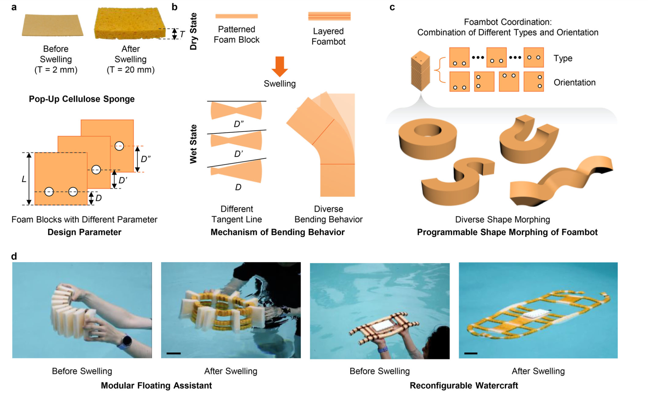 Sponge materials offer a unique combination of porosity, flexibility, compressibility, and responsiveness, yet their potential as primary elements in shape-morphing systems remains underexplored. Here, a modular shape-morphing platform constructed entirely from pre-compressed cellulose sponges, referred to as “foambots” is presented. Each block is geometrically patterned to induce anisotropic swelling, enabling programmable volumetric morphing upon hydration without external power or electronics. By stacking and orienting foambots in designed configurations, complex 3D structures capable of untethered transformation in aquatic environments are created. The large volumetric expansion (≈1:10 before and after morphing) allows for a unique compact form for easy transport and deployment. How key design parameters (block length, hole position, and orientation) govern bending behavior are systematically investigated, and inverse design strategies to achieve target geometries are demonstrated. Using this approach, two functional applications are realized, leveraging foambots’s programmable large volumetric expansion for deployable floating structures: a wearable flotation module that wraps around the user’s limb, and a self-propelling boat capable of expanding ≈463% of its original size when deployed, autonomous deploying, and traveling on water. These results establish cellulose sponge as a unique, sustainable material for morphing applications and introduce a scalable, low-cost strategy for creating deployable and reconfigurable soft structures.